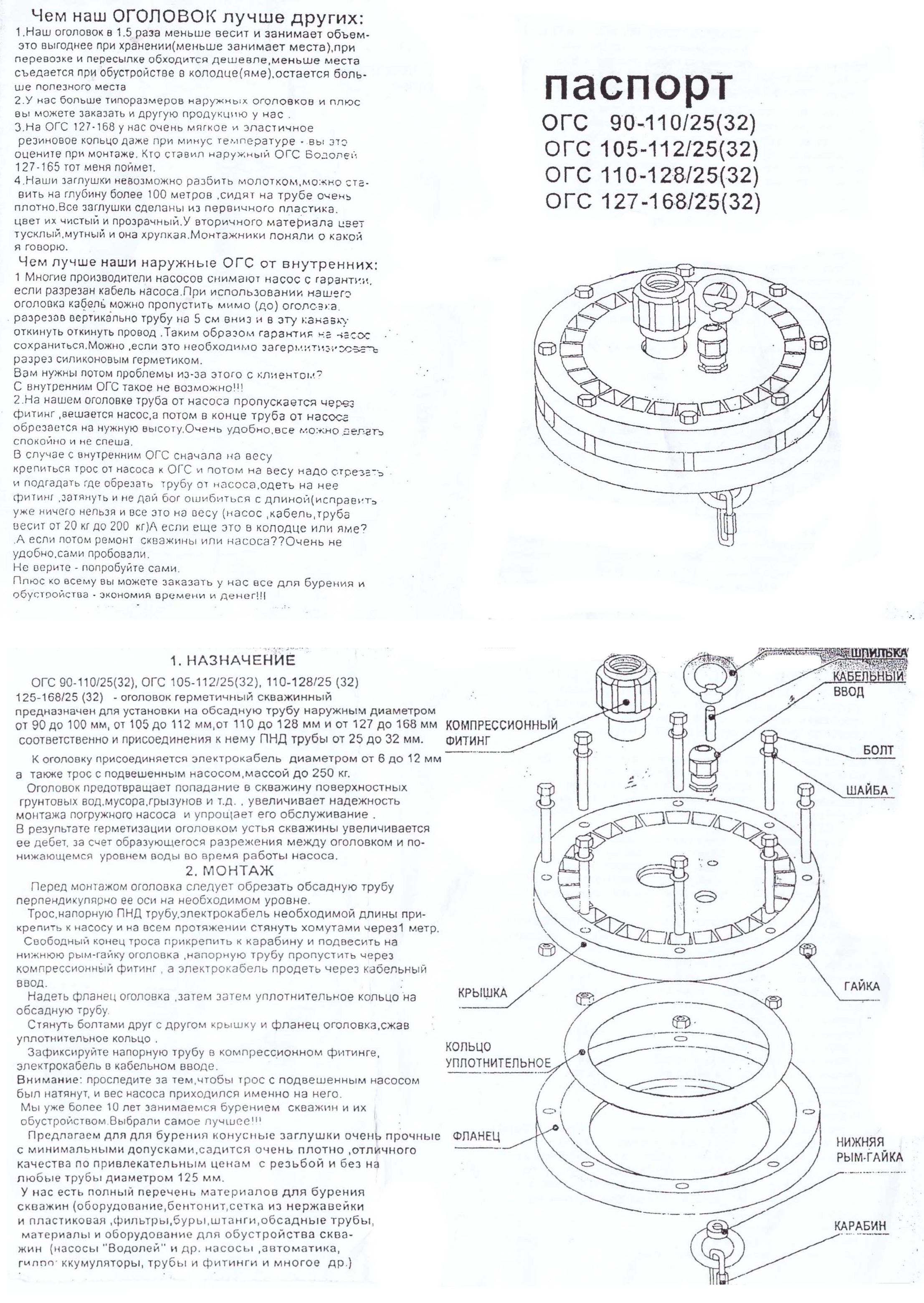 Оголовок  ОГС 110-128/32 - это полимерное изделие предназначенное для герметизации скважины сверху, с целью не попадания в ствол грунтовых, дождевых вод, а также пыли и грязи. Также оголовок имеет специальные выводы под электро кабель для насоса скважины и водоподъемной трубы.